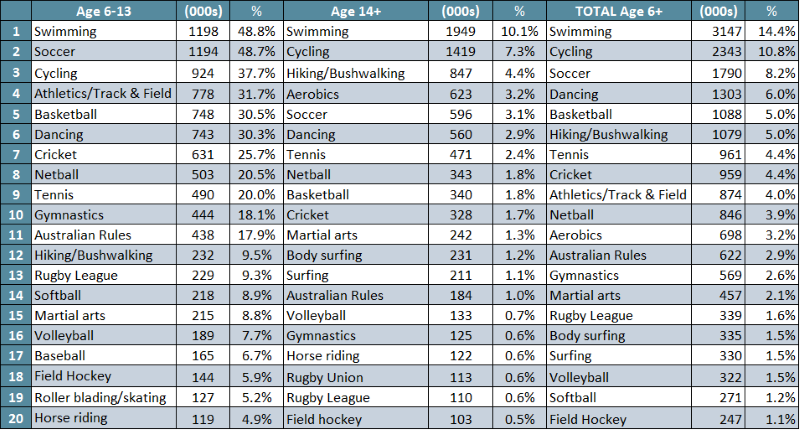 Combining data for the year to December 2014 from the Single Source survey of Australians aged 14+ and the Young Australians survey of kids aged 6-13 shows that overall 1 in 7 Australians regularly go swimming (14.4%), while nearly 1 in 9 go cycling (10.8%) and 1 in 12 play soccer (8.2%).