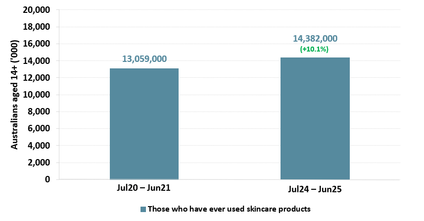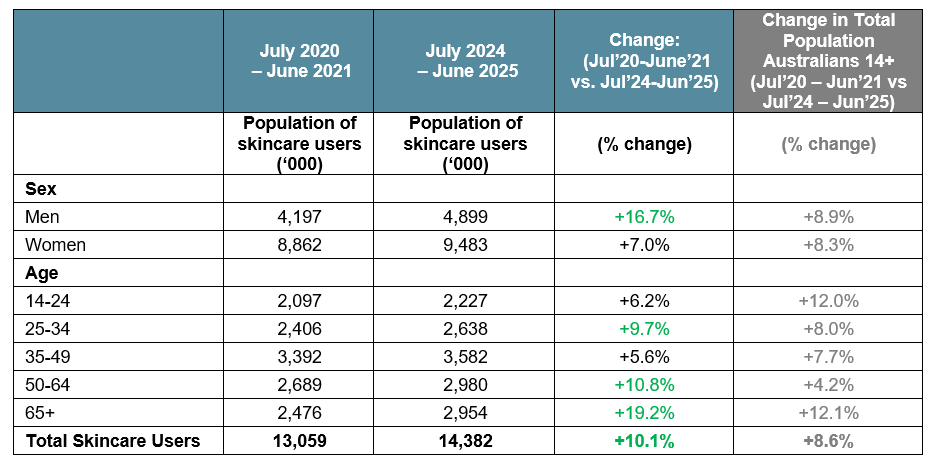 Source: Roy Morgan Single Source, July 2020 – June 2025. Rolling 12-month figures, average annual interviews, n=40,965. Base: Those who have ever used skincare products, Australians 14+. Percentage growth: () depicts growth from Jul’20-Jun’21 to Jul’24-Jun’25