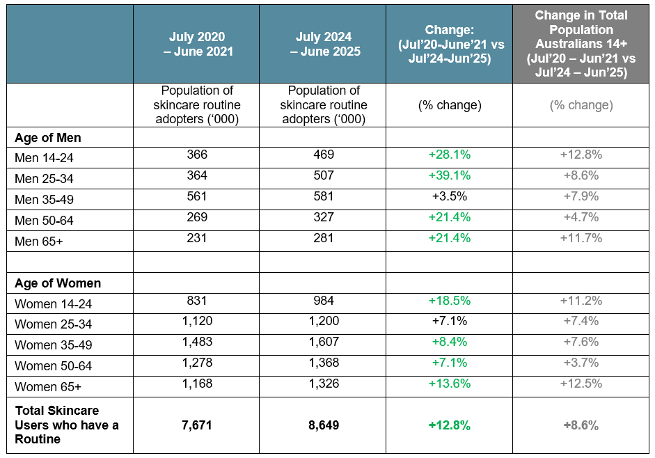 Source: Roy Morgan Single Source, 12 months to June 2021, n=23,215 and 12 months to June 2025, n=24,836. Base: Those who answered “Yes – Have a skincare routine”, Australians 14+. Percentage growth: () depicts growth from Jul’20-Jun’21 to Jul’24-Jun’25.