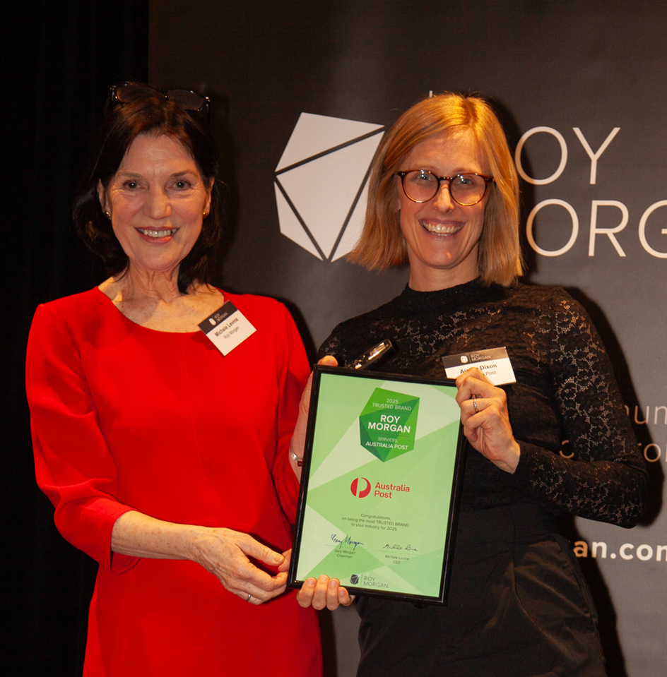 Picture: Roy Morgan CEO Michele Levine presents Australia Post’s General Manager of Brand & Marketing, Aimee Dixon, with the ‘Most Trusted Brand for Services’ for 2025 – a seventh straight win.