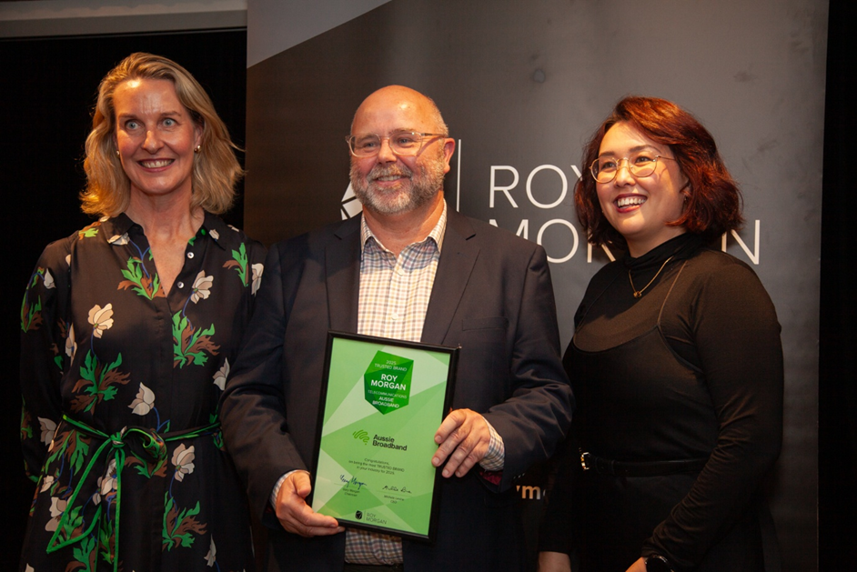 Picture: The team from Aussie Broadband including Chief Executive Officer Brian Maher (middle), flanked by General Manager of Corporate & Regulatory Affairs Libby Hay (left) and Communications Manager Holly Matthews Way (right) with the award for ‘Most Trusted Brand in Telecommunications.’