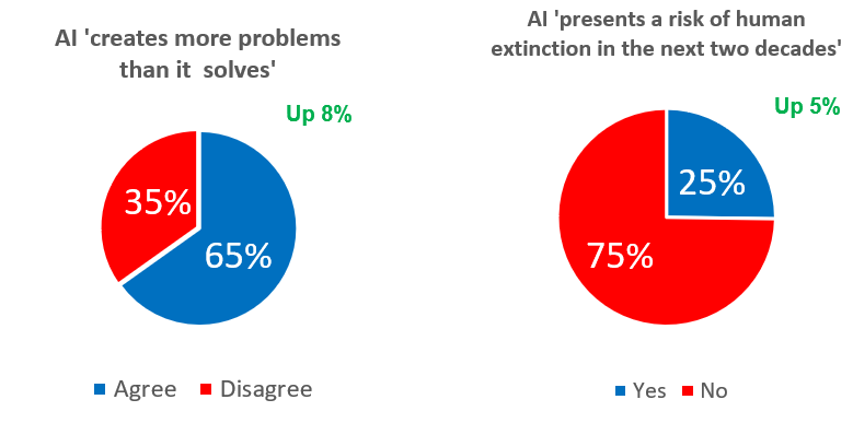 When asked, “Do you believe artificial intelligence (AI) presents a risk of human extinction in the next two decades?”, 25% of Australians said yes, and 75% said no, a 5% point increase in concern since 2023, when 20% said yes and 80% said no.