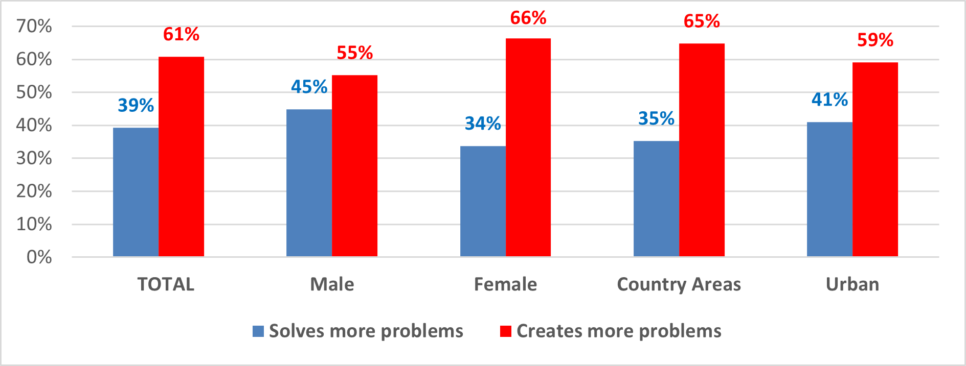 By age, Australians aged 35–49 are the least sceptical, with 62% saying AI creates more problems, while older Australians aged 65+ are the most sceptical at 68%.