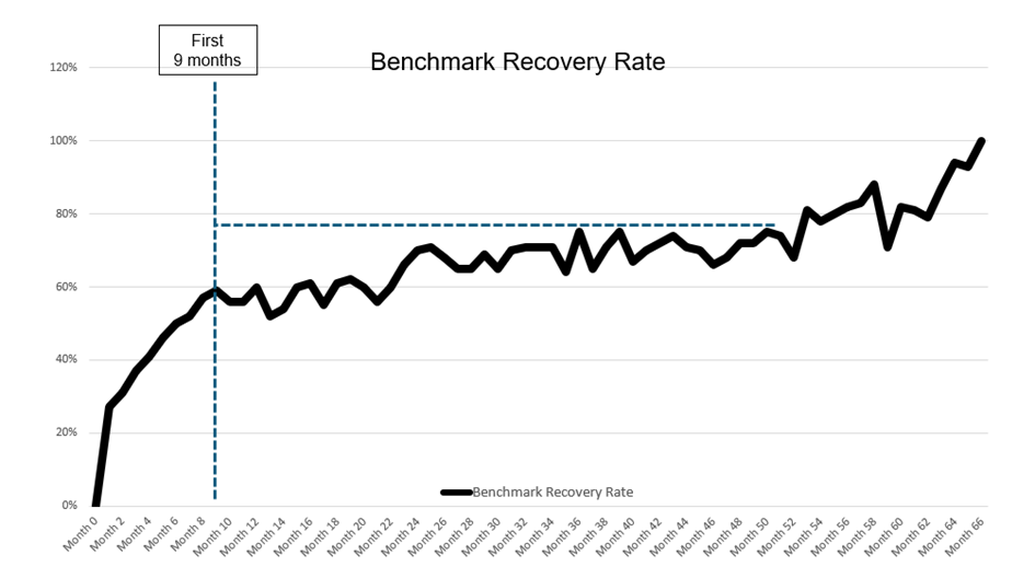 Averaging how long it took the 16 brands to recover, the chart below shows what the Benchmark Recovery Rate looks like over six years. What’s interesting is that if you haven’t achieved good recovery in the first 9 months, the next four years are a real slog.