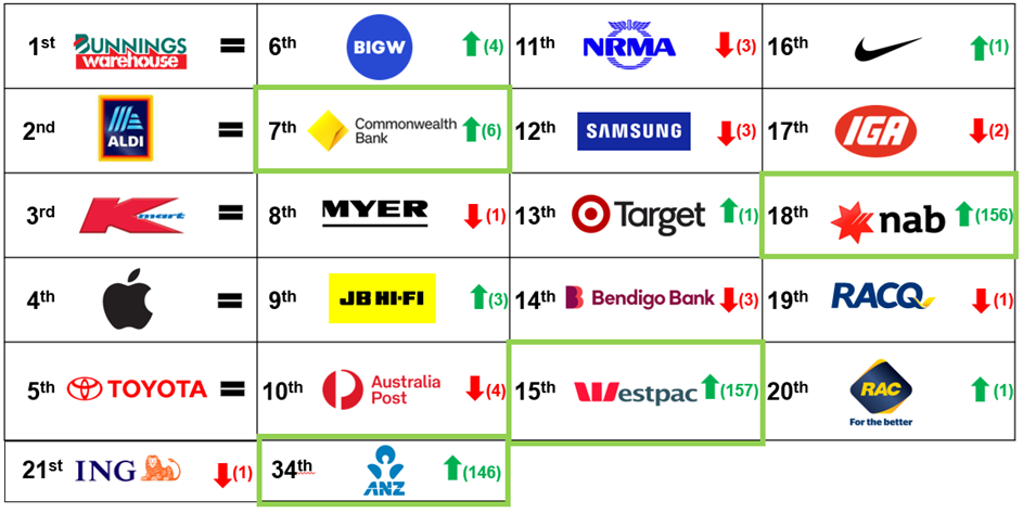 The biggest improvement of any brand – in terms of places gained compared to a year ago – is by Westpac which has soared a stunning 157 places to 15th position overall to be just behind the highly rated Bendigo Bank in 14th place overall.