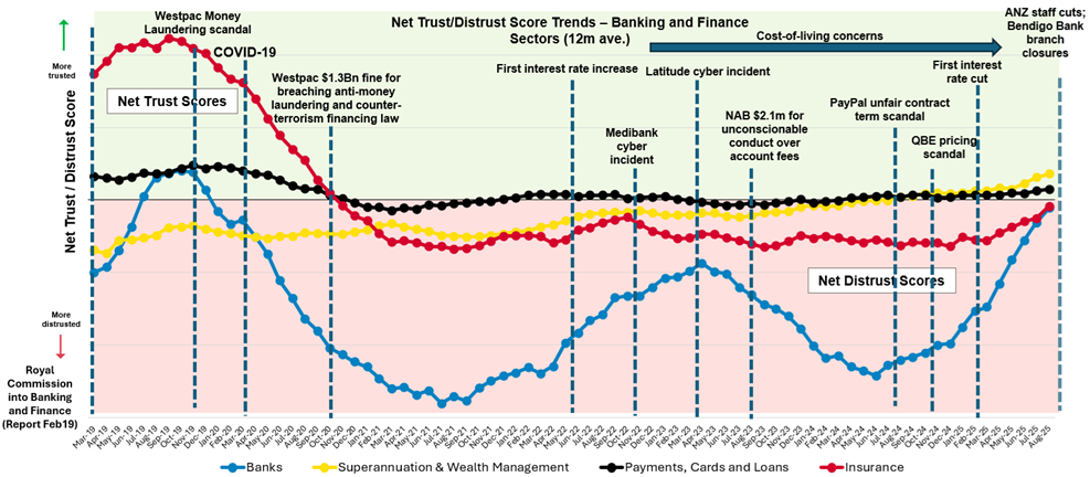 Net Trust and Distrust for the Banking & Finance Industries: Banks, Insurance, Superannuation & Wealth Management, and Payments, Cards & Loans