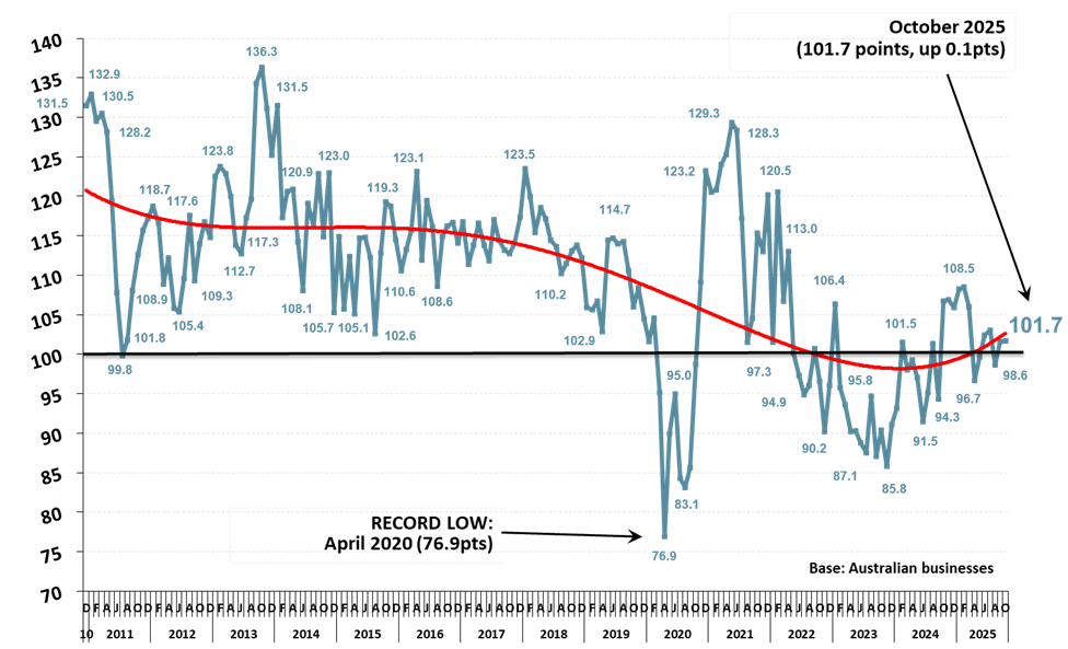In October 2025 Roy Morgan Business Confidence was virtually unchanged at 101.7. The result followed the Reserve Bank’s decision to leave interest rates unchanged in late September at 3.6%.