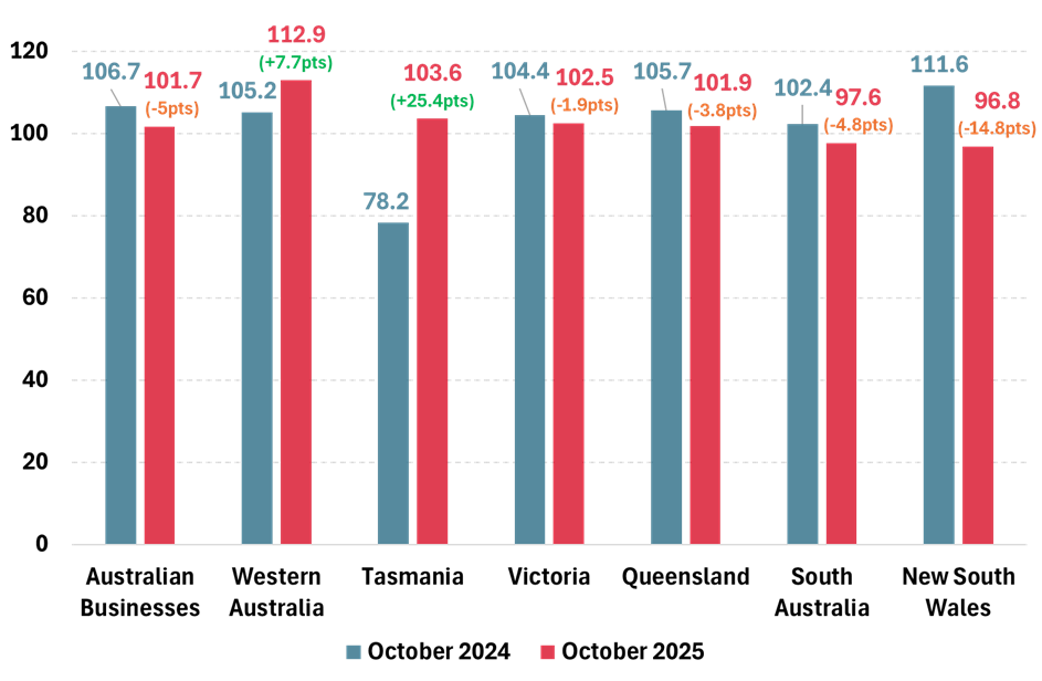 Source: Roy Morgan Business Single Source, October 2024, n=1,884, October 2025, n=1,411. Base: Australian businesses. *Tasmanian Business Confidence is measured over two months: Sept. & Oct. 2024 cf. Sept & Oct. 2025.