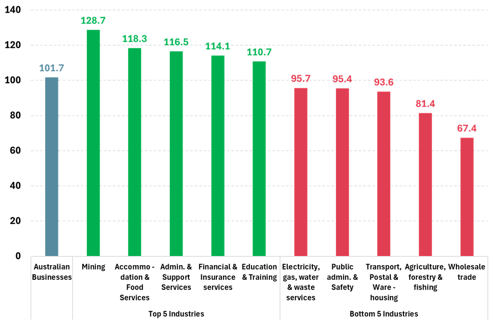 “At the other end of the scale are Wholesale Trade on only 67.4 and Agriculture, Forestry & Fishing on just 81.4 and the lowest average Business Confidence over a sustained period of the last three years of only 81.0 – clearly the lowest average of any of the 18 industries over this extended period.”
