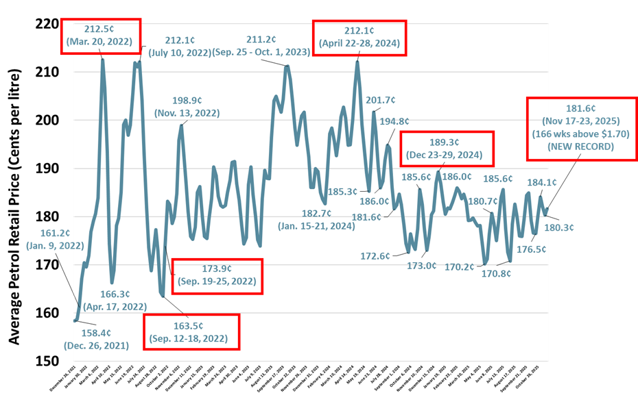During October, average retail petrol prices dropped three cents to $1.78 per litre – returning to their average price in August 2025. Average retail petrol prices started the month of October at $1.79 per litre and dropped during mid-October before increasing and ending the month on a high of $1.80 per litre. Since the end of October, average petrol prices have continued to increase so far in November.