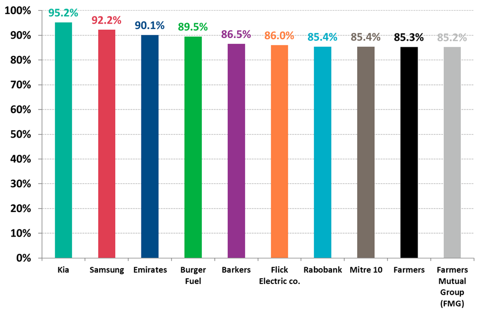 Filling out the top five positions were Mobile Handset Provider of the Year Samsung with a Customer Satisfaction of 92.2%, International Airline of the Year Emirates on 90.1%, Quick Service Restaurant of the Year Burger Fuel on 89.5% and Clothing Store of the Year Barkers on 86.5% in fifth place overall.