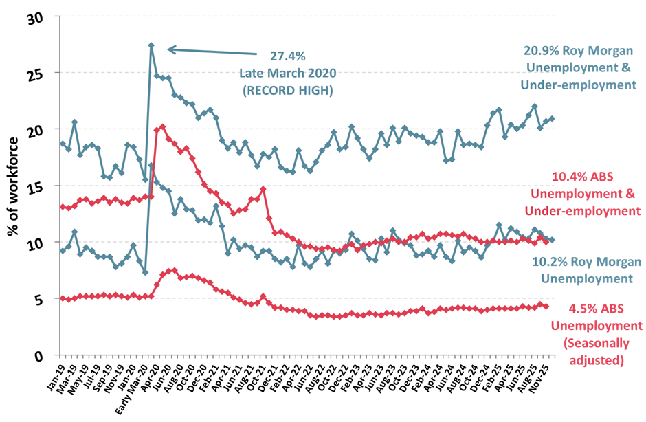 In November 2025, Australian ‘real’ unemployment was virtually unchanged at 1,628,000 (10.2% of the workforce), but under-employment increased 63,000 to 1,709,000 (up 0.3% to 10.7%).