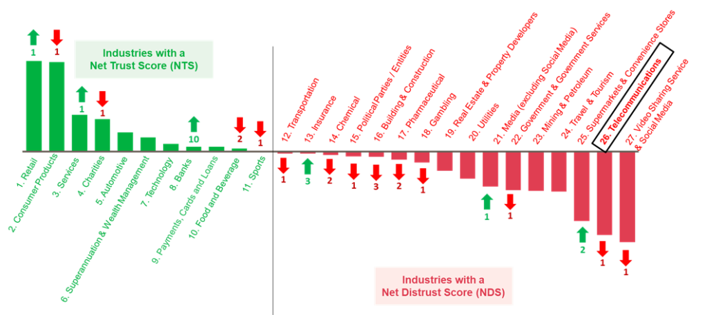 Net Trust/Distrust Score Rankings by Industry – Telecommunications is 26th out of 27 industries