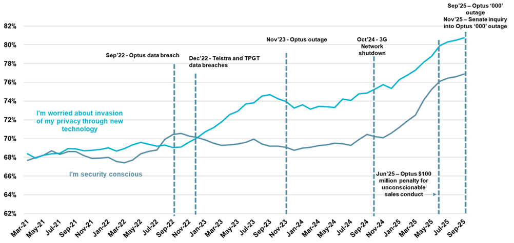 We saw some recovery through 2024, with distrust easing slightly. But the Optus September 2025 fatal triple-zero outage is likely to reverse those gains.