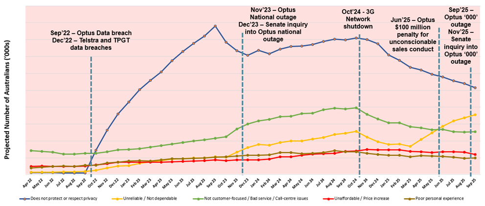 What’s striking is how the shape of distrust has shifted for Optus. Privacy (the blue line in the chart) was the dominant driver in the aftermath of the September 2022 breach – but over the past year, that intensity has eased. Not because the issue is “fixed,” but because people have adjusted; the shock has worn off.
