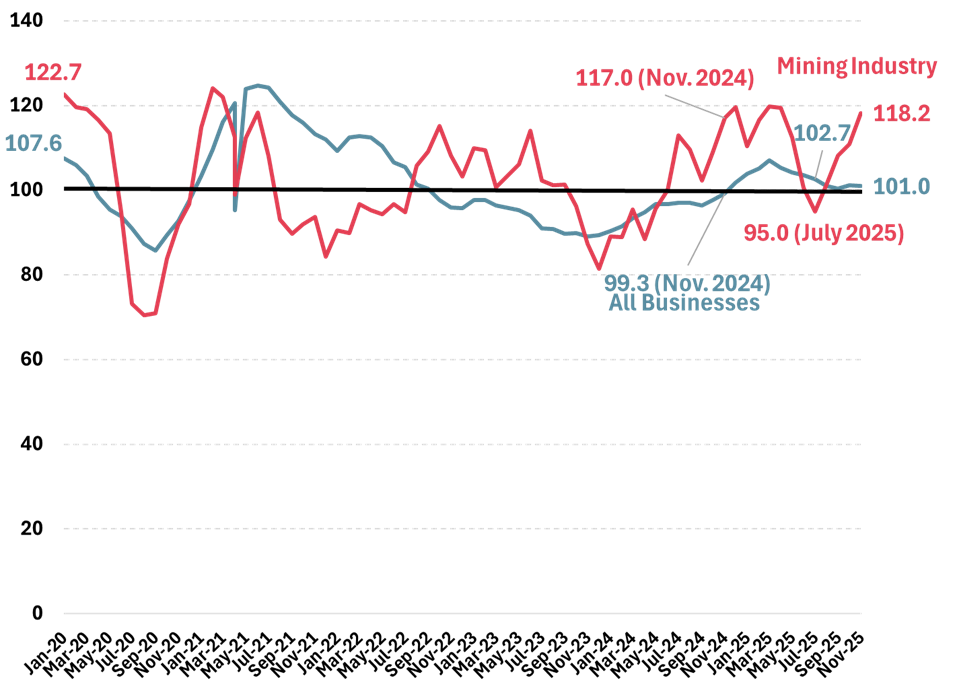 “Confidence in Australia’s mining industry has soared in recent months, increasing by 23.2pts (+24.5%) to 118.2 in the six months to November 2025, up from only 95.0 in the six months to July 2025. In contrast, broader Business Confidence has softened, down by 1.7pts (-1.6%) to 101.0 for the same period.