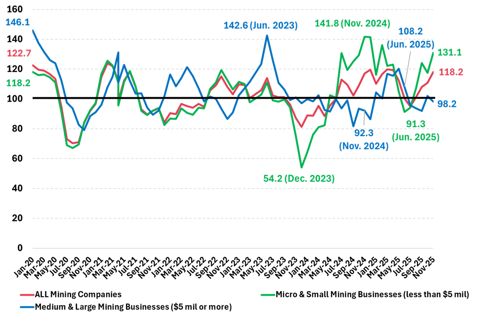 “A closer analysis of the mining industry shows smaller mining businesses – those with less than $5 million in annual revenue – have driven the increase in confidence. Confidence among the smaller miners has soared by 39.8pts (+43.5%) to 131.1 in the six months to November 2025, up from only 91.3 in the six months to June 2025. Confidence among larger miners has gone in the opposite direction – down by 10pts to 98.2 during the same period.