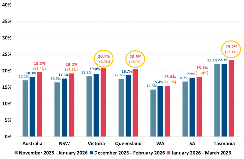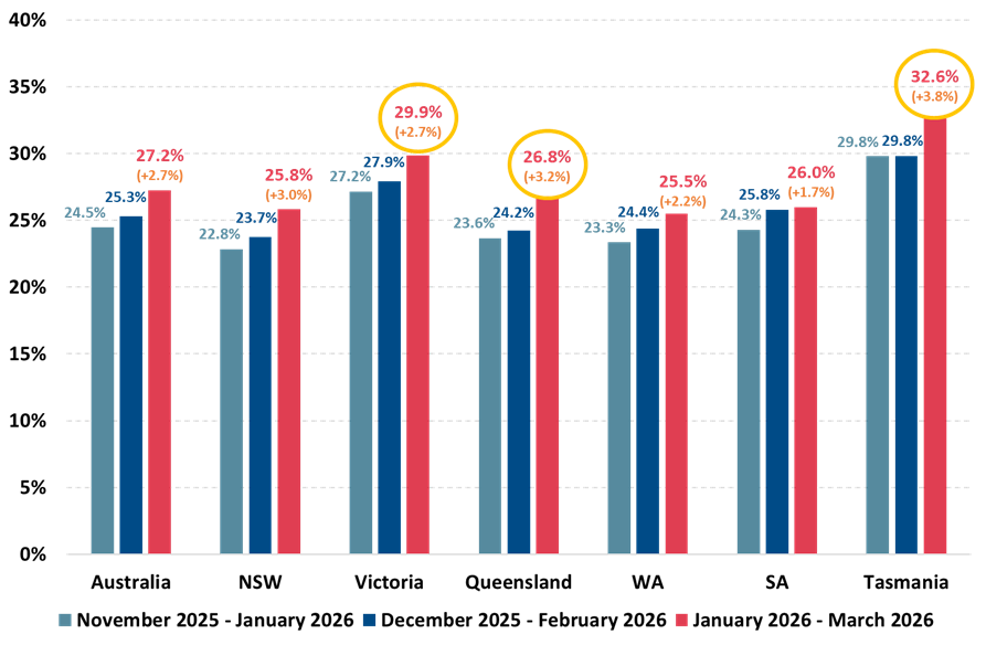 “Roy Morgan has modelled the impact of the interest rate increase in February by +0.25% to 3.85%,, and a potential interest rate increase of +0.25% to 4.1% in March 2026. If there is another interest rate increase in March, the level of mortgage stress will increase to 27.2% (up 2.7% points) – and this rate rise will hit mortgage holders hardest in Victoria, Queensland, and Tasmania.