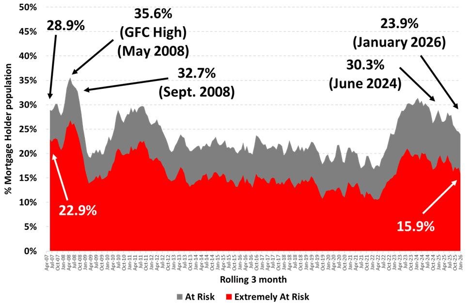 New research from Roy Morgan shows 23.9% of mortgage holders (1,184,000) ‘At Risk’ of ‘mortgage stress’ in January 2026, down 4% points from August 2025.