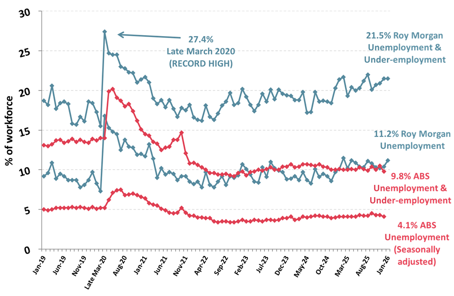 This Roy Morgan survey on Australia’s unemployment and ‘under-employed’* is based on weekly interviews of 946,159 Australians aged 14 and over from January 2010 to January 2026 and includes 5,057 telephone and online interviews in January 2026. *The ‘under-employed’ are those people who are in part-time work or freelancers who are looking for more work.