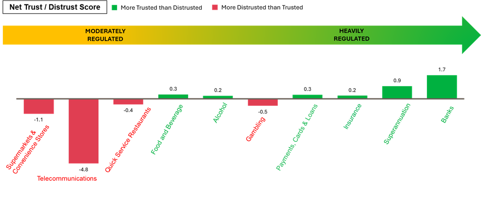 “At the other end of the scale, comparatively moderately regulated industries such as Telecommunications, Supermarkets & Convenience Stores, and Quick Service Restaurants, continue to experience elevated levels of distrust. In fact, in the latest results for the 12 months to December 2025 the Telecommunications industry is now the most distrusted industry of all.
