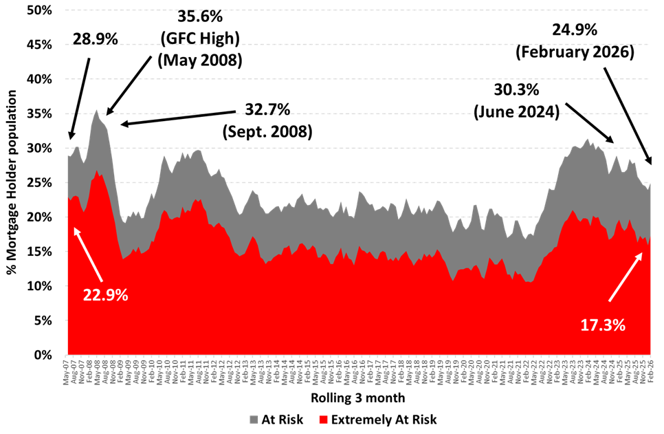 The number of Australians ‘At Risk’ of mortgage stress has decreased by 232,000 compared to a year ago when the RBA began a cycle of interest rate cuts which lowered rates by a total of 0.75% from 4.35% in February 2025 to 3.6% from August 2025 through to January 2026 – when the RBA raised rates.