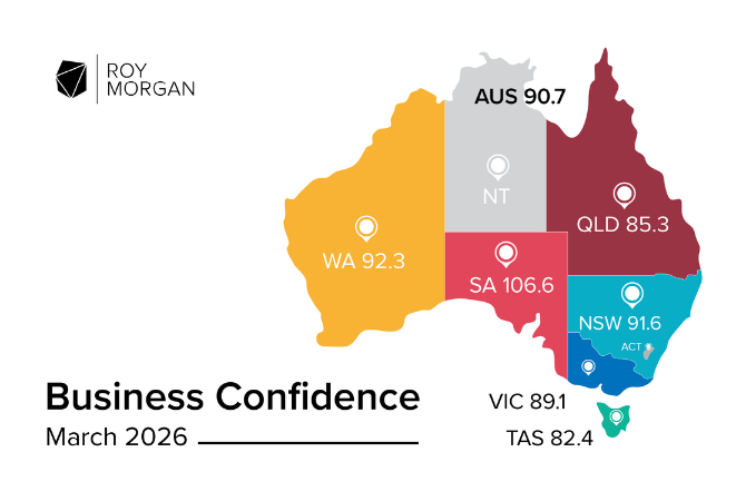 “Roy Morgan Business Confidence increased 2.1pts to 90.7 in March – a small uptick after large falls in the opening months of the year – January (down 7.6 points) and February (down 8.8 points). Despite the outbreak of conflict in the Middle East after Israel and the United States began attacking Iran at the end of February, the resultant increase in energy prices, and the Reserve Bank’s decision to raise interest rates in mid-March.