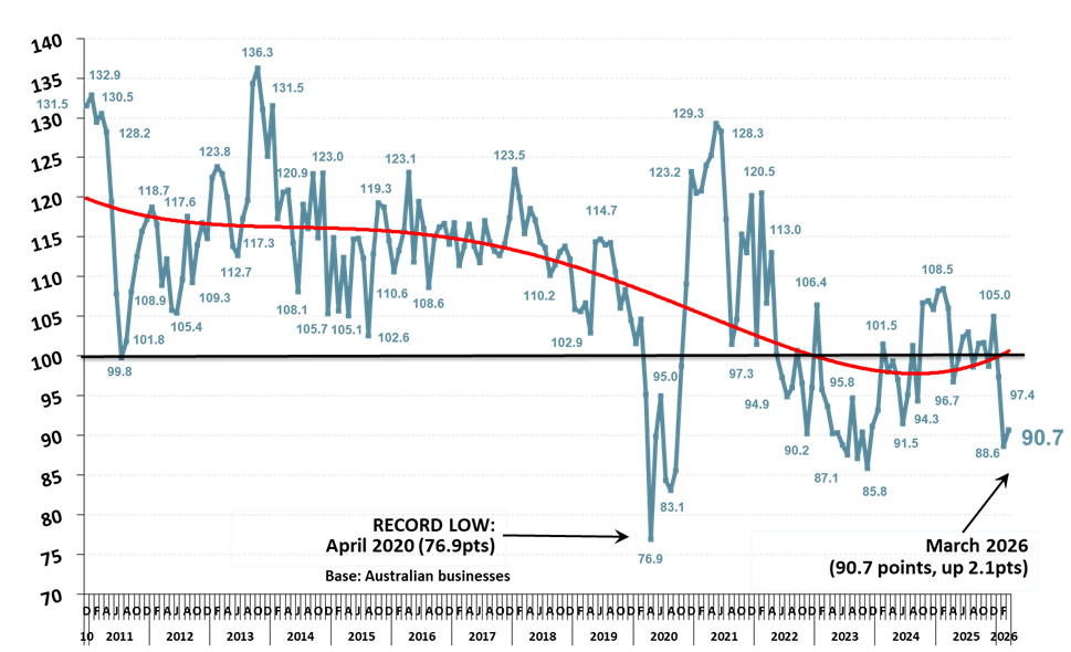 In March 2026 Roy Morgan Business Confidence increased 2.1pts to 90.7, recovering slightly from its lowest level since 2024. The small increase in March came after large consecutive falls in January (down 7.6 points) and February (down 8.8 points) and the index remains well below the neutral level of 100.