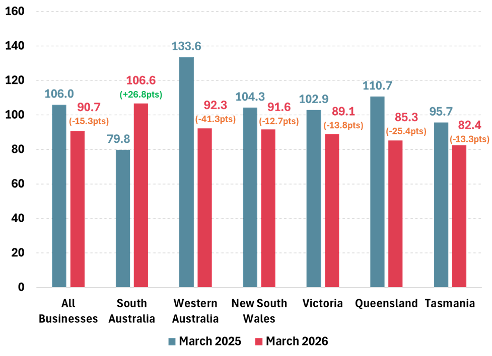 Source: Roy Morgan Business Single Source, March 2025, n=1,484, March 2026, n=1,054. Base: Australian businesses. *Tasmanian Business Confidence is measured over two months: Feb. & March 2025 cf. Feb. & March 2026.