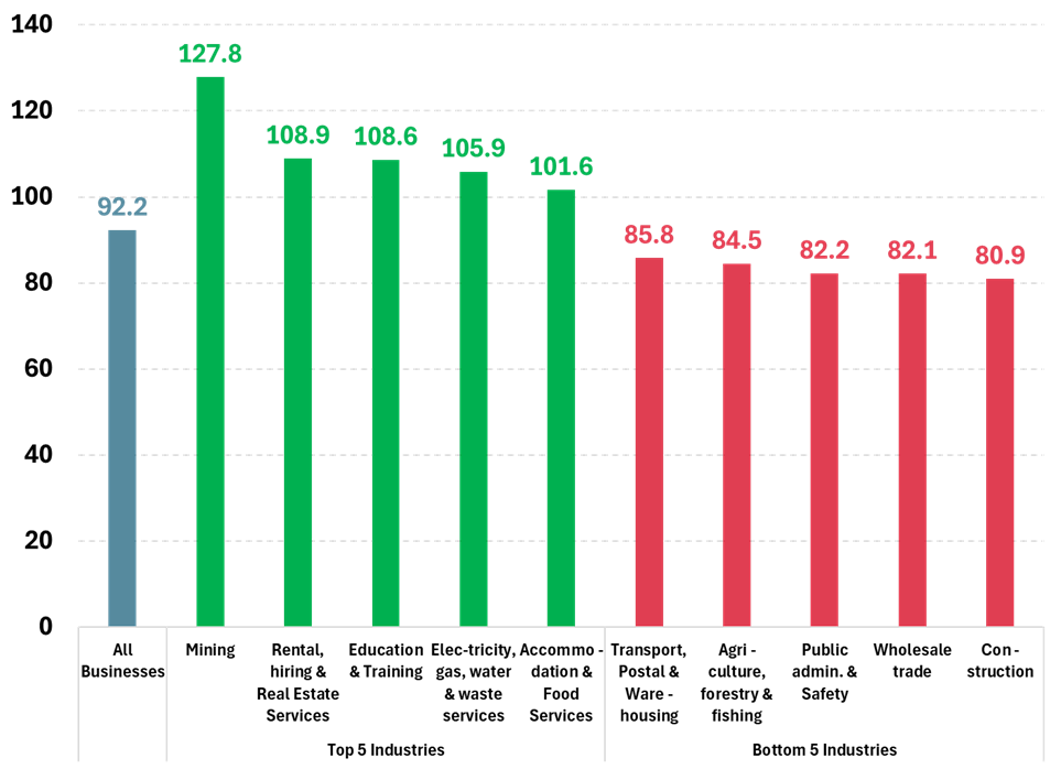 “Other confident industries are Rental, Hiring & Real Estate Services (108.9), Education & Training (108.6), and Electricity, Gas, Water & Waste Services (105.9) – all over 10 points above the national average.