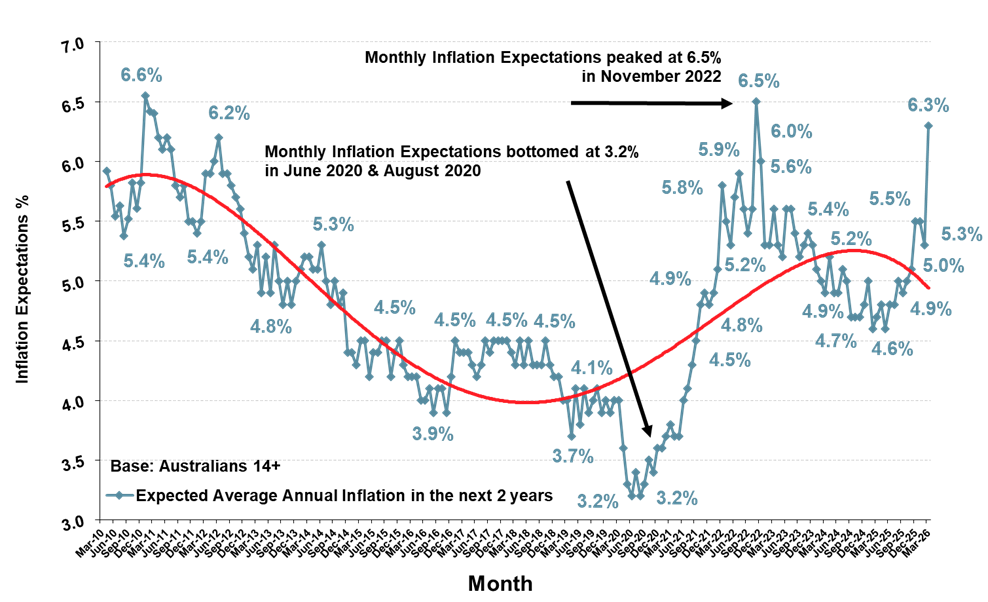 “ANZ-Roy Morgan Inflation Expectations in Australia have increased sharply since the United States and Israel began attacking Iran on the last day of February, increasing 1% point in the month of March to 6.3%, and now up a further 0.3% at 6.6% in late April.