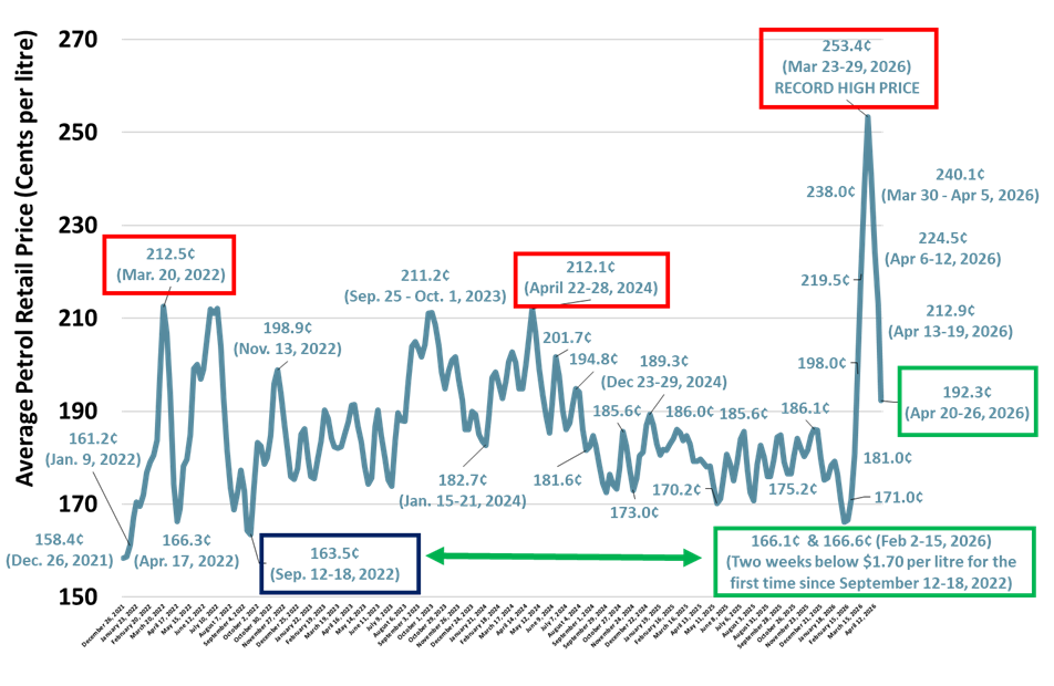 “Average retail petrol prices hit a new record high of $2.53 per litre in late March – representing an increase of over 87 cents per litre since mid-February, up by 52.6% in seven weeks. However, since peaking in late March, the cut in the fuel excise has led to a plummeting fuel price – now down over 60 cents a litre since late March (-29%).