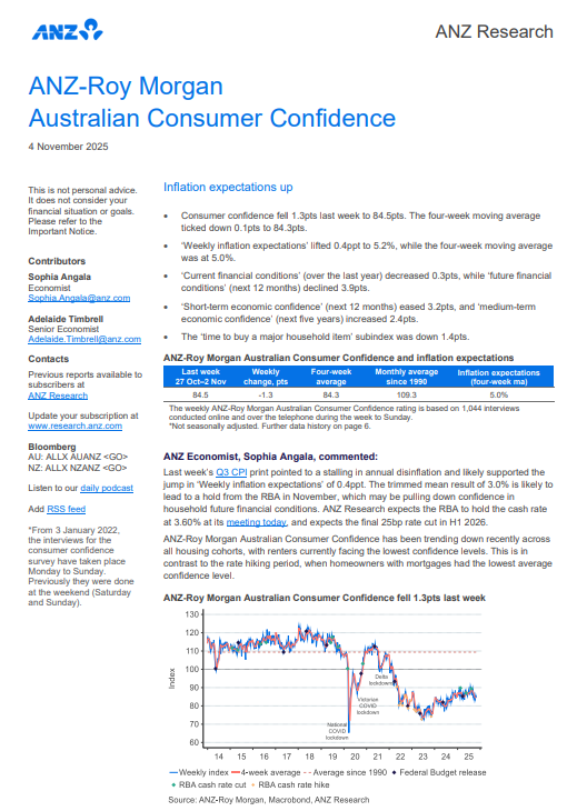 ANZ-Roy Morgan Consumer Confidence drops 1.3pts to 84.5 after higher-than-expected ABS CPI for September quarter ends speculation about more interest rate cuts this year