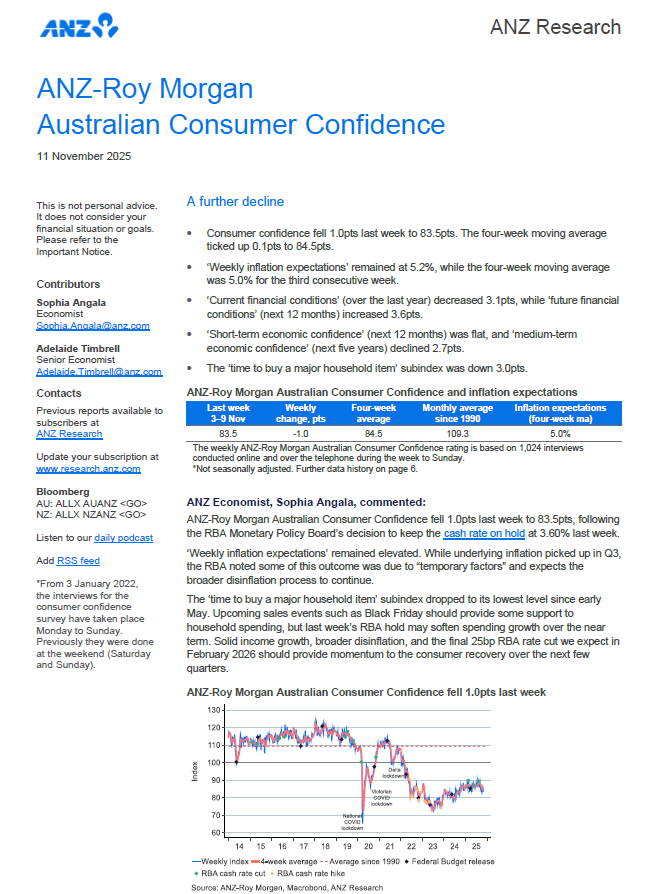 ANZ-Roy Morgan Consumer Confidence dropped 1pt to 83.5 and is now 3.2pts lower than a year ago, November 4-10, 2024 (86.7), and 3pts below the 2025 weekly average of 86.5.