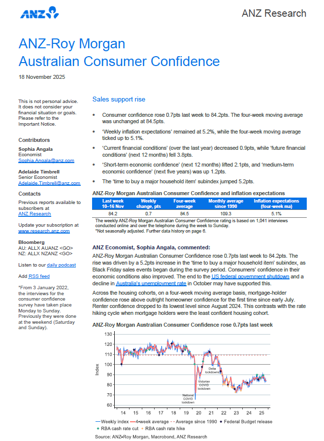 ANZ-Roy Morgan Consumer Confidence increased 0.7pts to 84.2 and is now 2.6pts lower than a year ago, November 11-17, 2024 (86.8), and 2.2pts below the 2025 weekly average of 86.4.