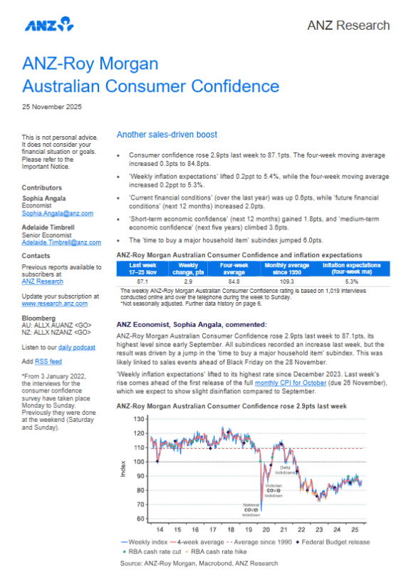 “ANZ-Roy Morgan Australian Consumer Confidence rose 2.9pts last week to 87.1pts, its highest level since early September. All subindices recorded an increase last week, but the result was driven by a jump in the ‘time to buy a major household item’ subindex. This was likely linked to sales events ahead of Black Friday on the 28 November.