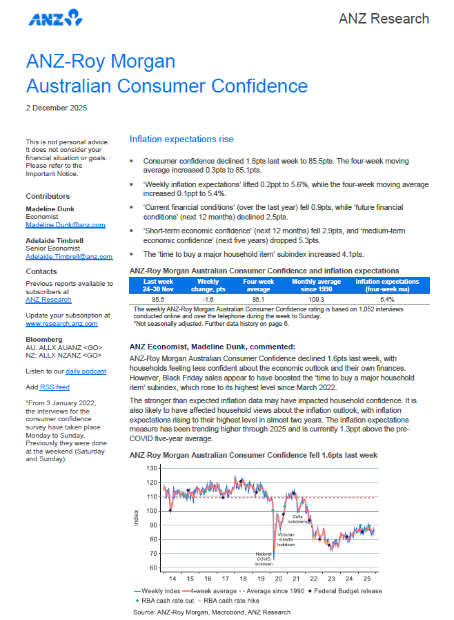 ANZ-Roy Morgan Australian Consumer Confidence declined 1.6pts last week, with households feeling less confident about the economic outlook and their own finances. However, Black Friday sales appear to have boosted the ‘time to buy a major household item’ subindex, which rose to its highest level since March 2022.