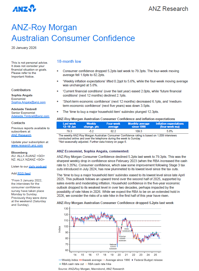 ANZ-Roy Morgan Consumer Confidence dropped by 5.2pts to 79.3 and is now 6.5pts lower than a year ago, January 13-19, 2025 (85.8), and 7pts below the 2025 weekly average of 86.3.