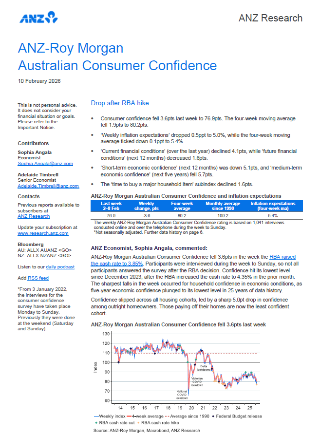 ANZ-Roy Morgan Consumer Confidence dropped 3.6pts to 76.9 in the week the Reserve Bank raised interest rates by +0.25% to 3.85% - its first interest rate increase for over two years since November 2023. This is the lowest Consumer Confidence rating since December 2023.