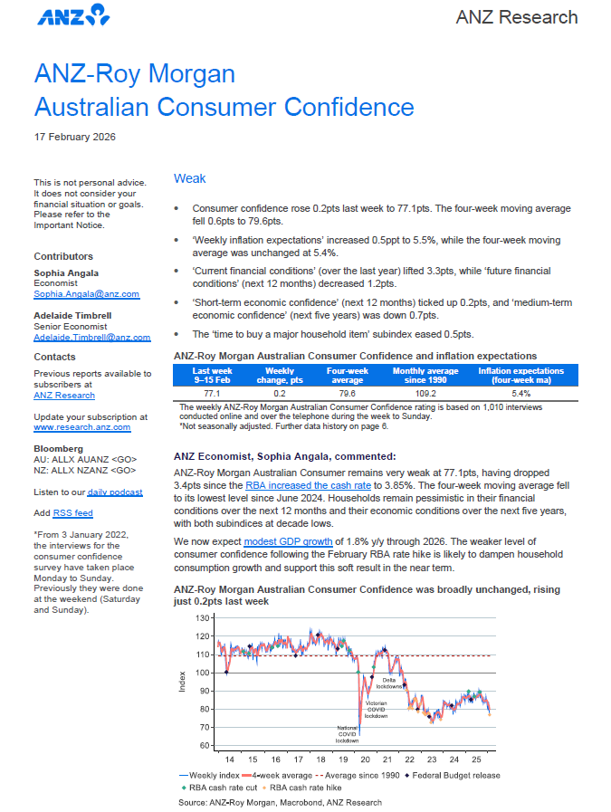 ANZ-Roy Morgan Consumer Confidence was virtually unchanged at 77.1 this week, near the more than two-year low reached a week ago. Consumer Confidence is now a large 8pts lower than a year ago, February 10-16, 2025 (85.1), and 3.3pts below the 2026 weekly average of 80.4.