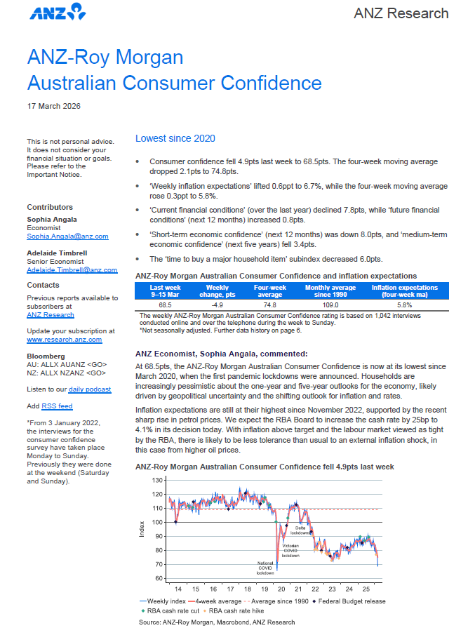 ANZ-Roy Morgan Consumer Confidence was down 4.9 points to 68.5 this week driven by falling confidence about personal finances and the Australian economy over the next year and next five years. Consumer Confidence is now a large 15.3pts lower than a year ago, March 10-16, 2025 (83.8), and now 9.7pts below the 2026 weekly average of 78.2.