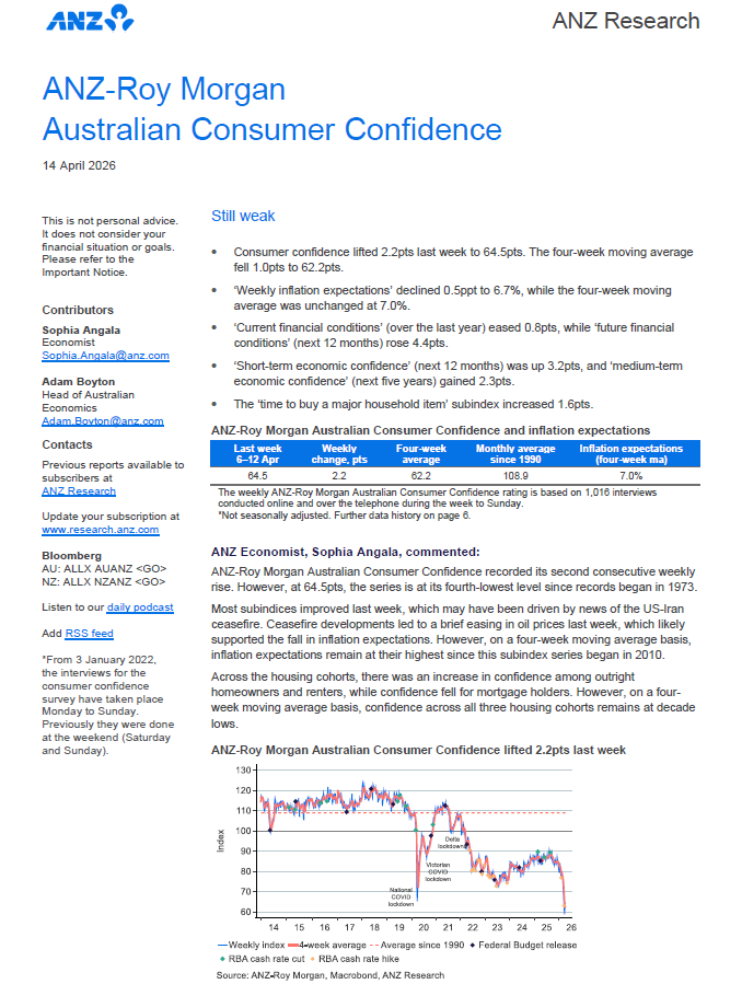 ANZ-Roy Morgan Consumer Confidence was up 2.2 points to 64.5 this week after a ceasefire agreement in the Middle East early last week and follows the cut to the fuel excise the previous week. Consumer Confidence is a large 19.7pts lower than a year ago, April 7-13, 2025 (84.2), and now 9.1pts below the 2026 weekly average of 73.6.