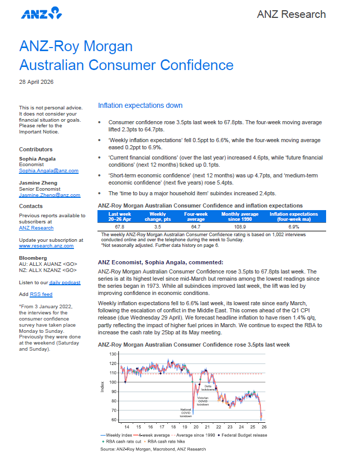 Weekly inflation expectations fell to 6.6% last week, its lowest rate since early March, following the escalation of conflict in the Middle East. This comes ahead of the Q1 CPI release (due Wednesday 29 April). We forecast headline inflation to have risen 1.4% q/q, partly reflecting the impact of higher fuel prices in March. We continue to expect the RBA to increase the cash rate by 25bp at its May meeting.