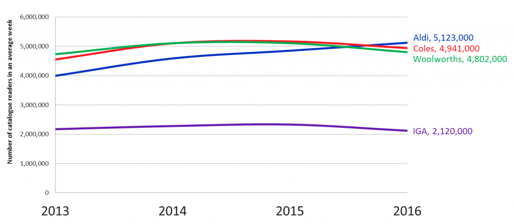 In an average week during 2016, 5.1 million Australians (aged 14+) read or looked into an Aldi catalogue. For the first time, Aldi’s weekly catalogue reach surpassed that for Coles (4.9 million) and Woolworths (4.8 million).