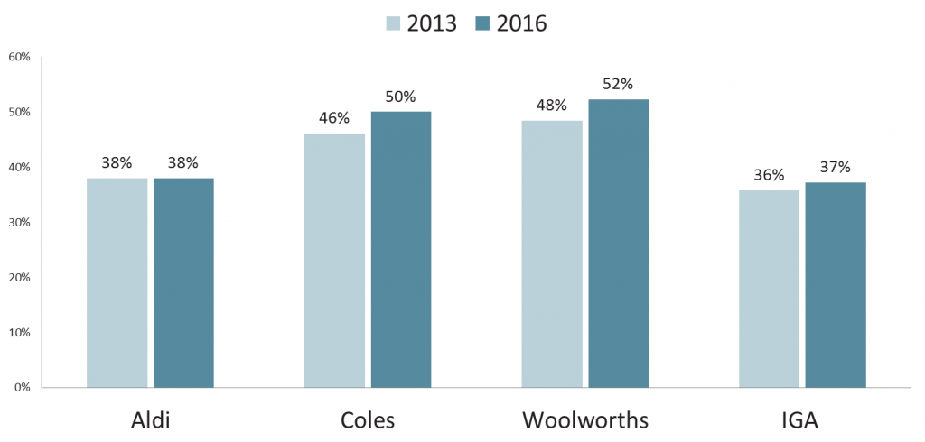 Aldi’s reader-to-shopper conversion rate is unchanged over the period at 38 percent, while IGA’s has grown from 36 to 37 percent.