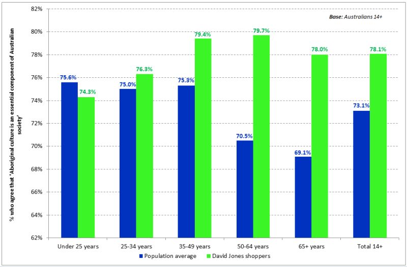 David Jones’s decision shows a thorough understanding of their customers, who are consistently more likely than the average Australian to believe that Aboriginal culture is important to our nation. Whereas 73.1% of Australians aged 14+ agree that ‘Aboriginal culture is an essential component of Australian society’, this figure rises to 78.1% of people who shop at DJs in an average four weeks.