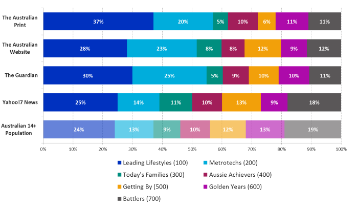 “Worldly and Wise (106), Humanitarians (107) and Successful Bureaucrats (108) are each between 30-85% more likely to visit The Guardian than The Australian’s website, while Blue Chip (101), Financial Freedom (105), Savvy Self-Starters (110) and Set for Life (111) prefer The Oz.