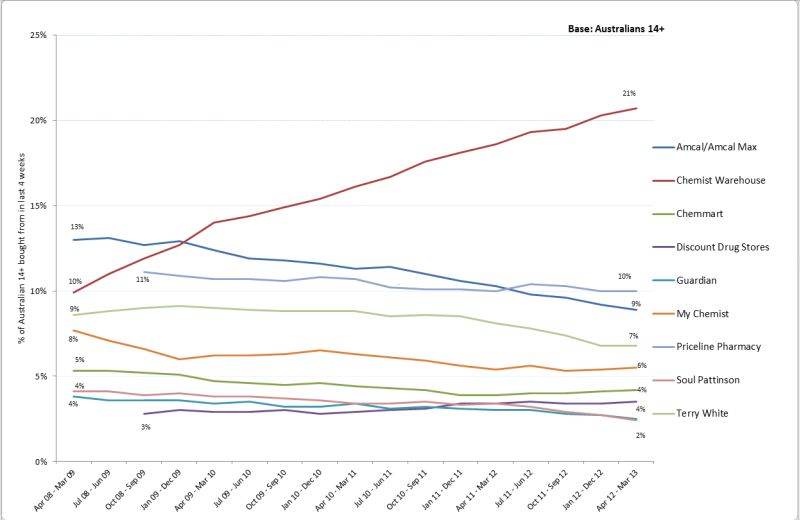 Source: Roy Morgan Single Source (Australia), Apr 2008 – Mar 2013, average annual sample =19,490 (Note: Amcal includes Amcal Max)