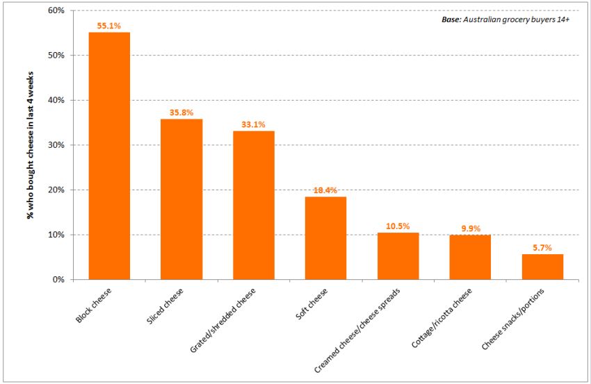 In an average month, 76.3% of Australian grocery buyers (aged 14+) purchase at least one kind of cheese. Block cheese is the most popular, with 55.1% of grocery buyers purchasing it in an average month, followed by sliced cheese (35.8%) and grated/shredded cheese (33.1%).