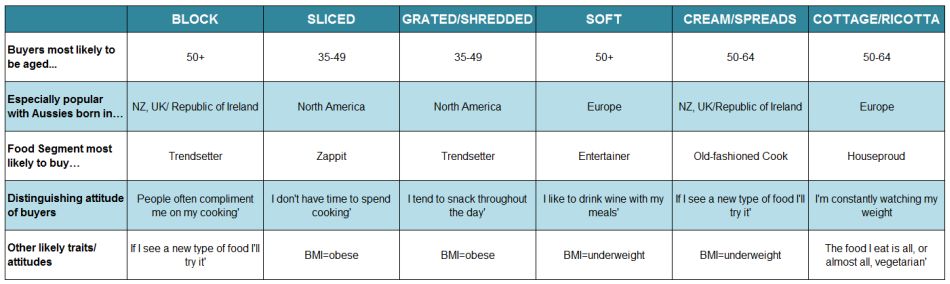 “The ethnic background of cheese buyers is also interesting. Obviously a higher number of Australian-born Aussies buy cheese than any other group, but higher proportions of people from non-Australian backgrounds buy it: with Kiwis, British- and European-born Aussies, and North Americans all distinguishing themselves for different cheeses. Without exception, people of Asian descent are well below average for buying cheese.